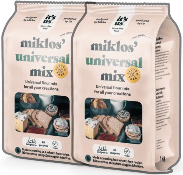 A gluténmentes sütés sosem volt ilyen egyszerű: kenyér, süti, pizza vagy palacsinta is könnyedén elkészíthető. Az It’s us Miklós Universal Mix a konyha sokoldalú alapja, amely nem tartalmaz glutént, tejet, tojást vagy szóját. Szinte bármilyen recepthez használható, mégis megőrzi a hagyományos ízeket és állagot. Ideális választás azoknak, akik tudatosan étkeznek vagy speciális étrendet követnek. Felhasználási javaslat: