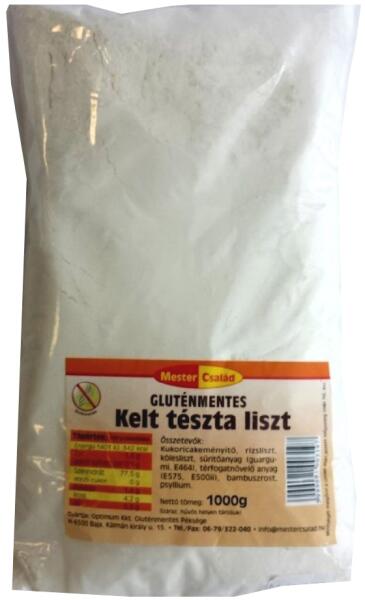 Összetevők: kukoricakeményítő, rizsliszt, kölesliszt, sűrítőanyag(guargumi,   E464), térfogatnövelő anyag(E575, E500ii), bambuszrost, psyllium. Nettó tömeg:1000g Tápérték 100g termékben:Energia: 1403 kJ/342 kcalFehérje: 1,4gSzénhidrát: 77,5gebből cukor: 0gZsír: 1,4gebből telített: 0,3gSó: 1,4gRost: 4,2g  Receptek: Kelt kalács: Hozzávalók: 1kg mester kelt kalács liszt, 10dkg margarin, 8,5 dl tej, 5dkg élesztő, 2 tojássárgája, 10dkg cukor, só. Elkészítése: a tésztát összeállítjuk, és négy részre osztjuk kb. 1 ujjnyi vastagra nyújtjuk. Ízlés szerinti töltelékkel töltjük. Túrós: 25dkg túró, 15 dkg cukor, vaníliás cukor Mákos: 10dkg mák, 10dkg cukor, 1 citrom reszelt héja Almás: 20dkg alma, ízlés szerinti cukor, 1 kanál lékötő, fahéjA kelesztés előtt a tekercsek tetejét tejfölös tojássárgájával kenjük meg. Duplájára kelesztjük. 180 Celsius fokos sütőben tűpróbáig sütjük. (Ez kb. 50 perc) Gyártja: Optimum Kkt. Gluténmentes pékségeH-6500 Baja, Kálmán király u. 15. Tel. /Fax: 06-79/322-040info@mestercsalad. hu